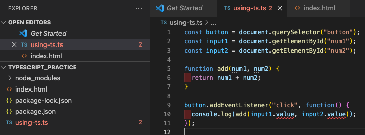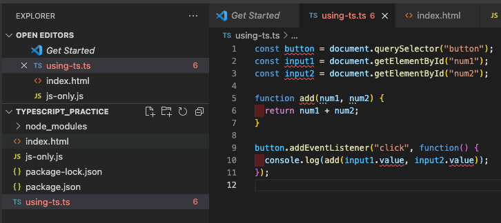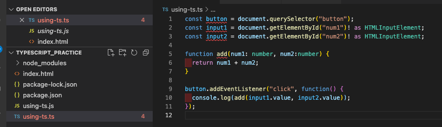 사진처럼 같은이름의 using-ts.js 자바스크립트 파일이 생겼고 이로인해 ts파일에서 button, input1 등 이미 존재한다고 빨간줄이 생긴걸 볼수있다. 이는 타입스크립트가 두 파일을 동시에 사용하지 않을 것이라는 것을 이해하지 못했기때문에 생긴것이다. 즉 중복 함수 구현과 관련된 IDE에서 에러가 발생 할수 있기 때문이다.