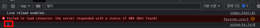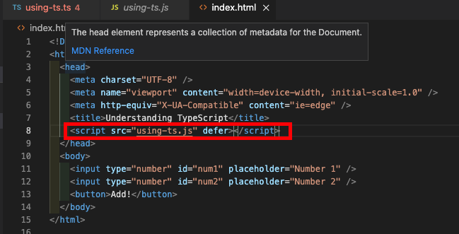 이제 위의 사진처럼 index.html 파일에 using-ts.js을 경로에 넣어준다. 이때 브라우저가 타입스크립트를 실행 할수없다고 이야기했던것처럼 항상 자바스크립트 파일을 가져와야한다.