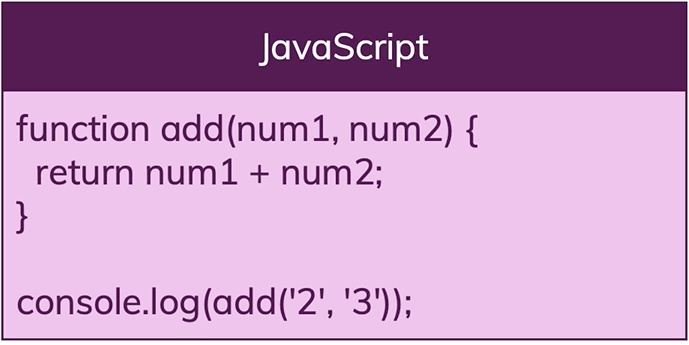숫자가 아닌 문자열 ‘2’ 와 ‘3’ 을 더하는 함수이다. 이럴때는 원하지 않는 결과가 나올것이다. 따라서 5가 아닌 두숫자는 ’23’이 된다.
