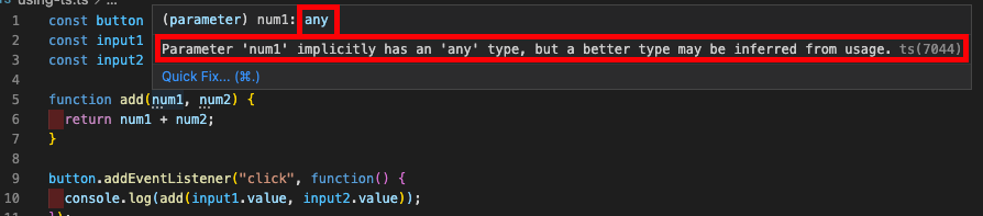 가장 큰 장점은 additional type (추가적으로 타입 선언) 이다. 위의 코드에서 num1이라는 인자에 마우스를 올리면 타입은 any 라고 나타내며 파라미터 num1은 절대적으로 any 타입을 가지고 있지만 더 나은 타입이 사용될수도 있음을 추론할수있다고 한다. 이것은 타입 장애를 말하는게 아닌 어떤 타입의 값이든 될수있다고 알려주는것이다.