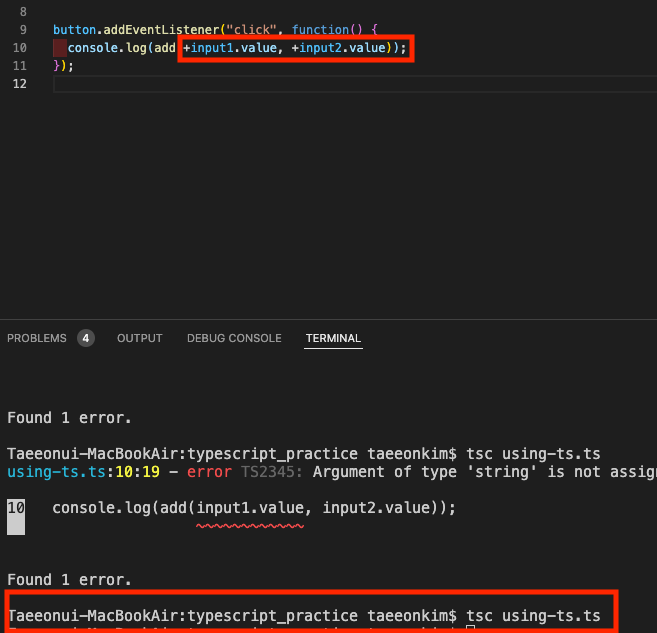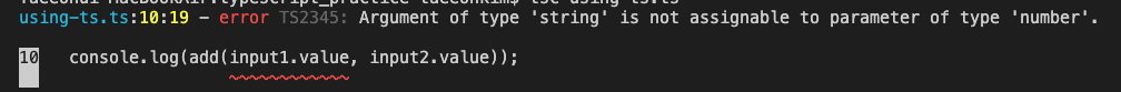 따라서 위에 + 과 같이 string을 number 형식으로 바꿔 넘겨주고 다시 tsp using-ts.ts 하면 에러가 없이 컴파일하는걸 알수있다.