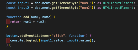 이때 input1 에 ! 느낌표를 붙여서 요소를 얻을것임을 타입스크립트에 알려주어 이것이 결코 null 을 야기시키지 않을것을 알려주는것이다.