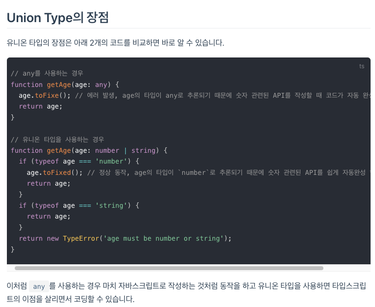 Union 타입 = string | number | boolean 등 한가지가 아닌 여러개의 다른 타입을 받을때 파이프기호(|) 사용 => 타입스크립트를 좀더 flexible 하게 만들어주기위해서 사용