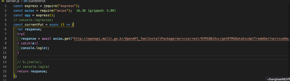 서버를 열기위해 express 사용하였고 오픈api를 요청하기위해 axios 를 썼다.