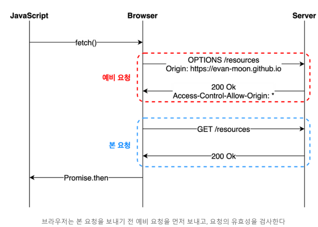 보안상의 이유로 브라우저는 스크립트에서 시작한 교차 출처 HTTP 요청을 제한한다. -> (궁금한점: 서버나 클라이언트에서 http를 요청시 똑같은 js 파일에서 요청을 하는데 어떻게 구분하여 제한하는지?? 스크립트라하면 결국 js코드가 DOM으로 브라우저 상에 보여지는 소스인지 아닌지 판별하나?)