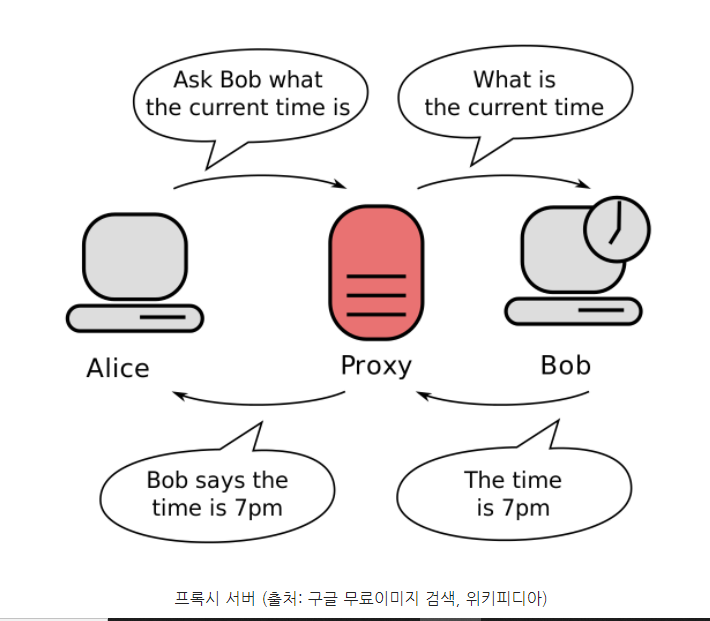 클라이언트가 자신을 거쳐 다른 네트워크에 접속할 수 있도록 중간에서 대리해주는 서버. 서버와 클라이언트 사이에서 대리로 통신을 수행해주는 것을 프록시라고 하고 그 기능을 하는 서버를 프록시 서버라고 부르게 되는 것 이다.