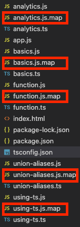 sourceMap 옵션을 true 로 설정하면 다음과 같이 기본에 있던 파일에 .js.map 이 추가로 생성된다.