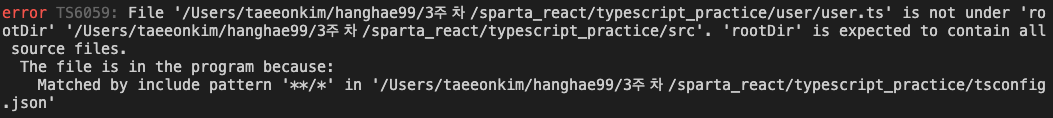 이렇게 rootDir 를 src 로 설정했기때문에 위와같이 src 폴더밖에 ts파일을 생성할경우 위와같은 에러가 발생하게된다. 왜냐하면 rootDir 하위에 담기지 않았기 때문이다.