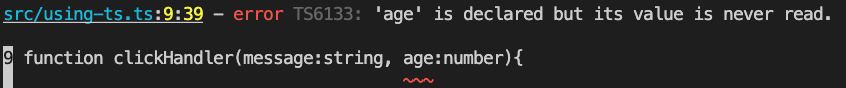 마찬가지로 매개변수로 넘겨준 값이 사용되지 않는다면 이 noUnusedParameters를 true 로 설정하면 노란 밑줄과 함께 에러로 판단하여 보여준다.