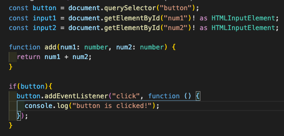 따라서 이렇게 하면 if문을 통해 타입스크립트가 null인지 아닌지를 판별할수있기 때문에 에러없이 잘되지만 분명하게 button이 존재하는지을 알기때문에 ! 을 쓴다면 코드양을 줄일수있으므로 아주 좋은 옵션이다.