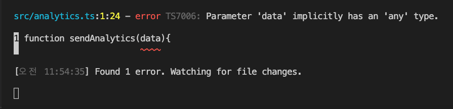 다음과 같이 data를 인자로 받고 콘솔로그로 출력하는 함수를 만들었고 ‘The data’ 라는 string 문자열을 인수로 넘겨주었다. 하지만 다음과 같이 any type으로 에러가 뜨는걸 알수있는데 이게 noImplicitAny 옵션이다.