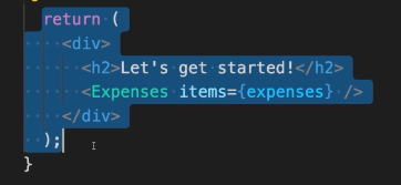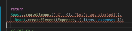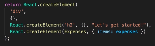 div 라는 요소를만들고 두번재 인자는 속성값 , 없으므로 빈칸{}, 그리고 자식요소로 h2와 Expenses 컴포넌트가 있으므로 3번째 인자에 h2를 똑같이 생성해주는 코드를 만드러주고4번째 인자에 Expenses 컴포넌트를 넣어준다.이때 기존 내장된 HTML이 아닌 커스텀된 컴포넌트이므로 ‘’ 없이 이름만 써준다. 이때 Expenses는 props를 넘겨주기 때문에 ㅁitems 이라는 이름으로 expenses 라는 데이터를 넘겨주었다. 이렇게하면 JSX 코드가 React 객체로 생성하여 만들었을때의 모습이다.