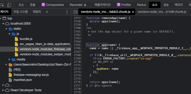 페이지->검사 가면 소스에서 static/js 같은 폴더에 변형된 js파일들이 있다. -> 왜냐면 여기서는 jsx 코드가 없고 브라우저가 jsx코드는 지원하지 않는다.