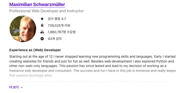 일단 강사는 Maximilian 이라는 외국강사인데 약2백만명의 수강생과 74만리뷰, 총 4.7이라는 평점을 가지고있는 어마무시한 사람이다.