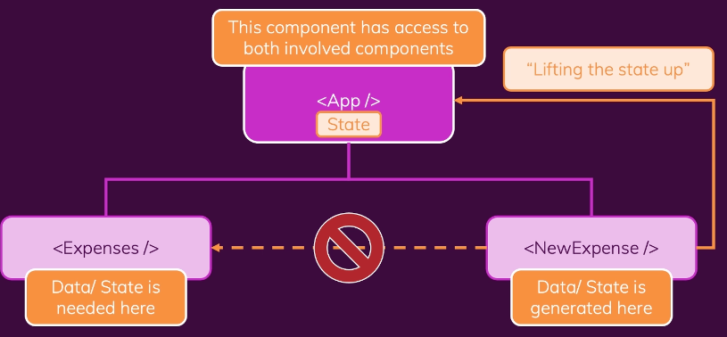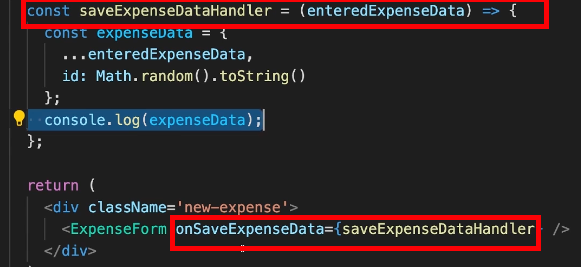 부모컴포넌트에서 함수를 만들고 함수를 props로 넘겨준다. 함수의 pointer를 onSaveExpenseData변수 prop으로 넘겨주었기때문에 자식컴포넌트에서 해당 함수를 쓰게되면 부모에 있는 함수로 돌아가서 실행하게된다.