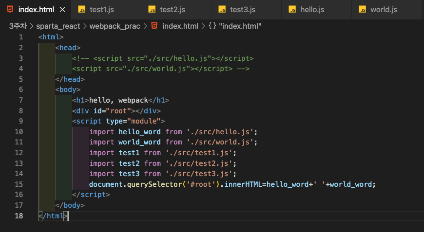 그리고나서 index.html에서 하나하나 불러와서 썼던 import와 그 script태그를 지우고 index.js를 만들어 모아주었다.