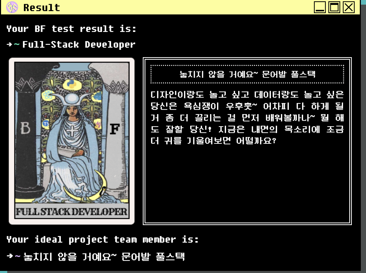 카카오톡 개발자 오픈채팅방중에서 누군가 링크를 공유해줬는데 프론트, 백엔드 성향찾기라고해서 해봤다.