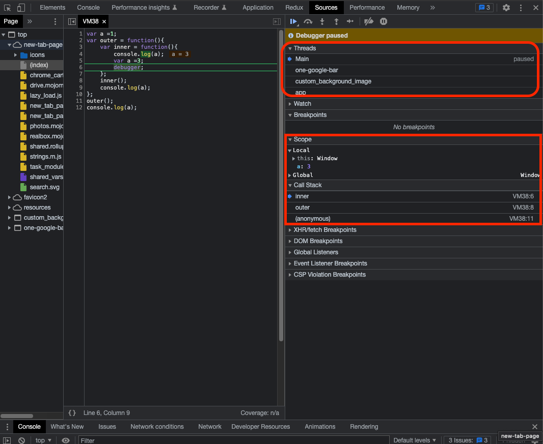 위와 같이 코드가 있다고한다면 inner함수안에서 변수 a가 선언되고 다시 할당되는걸 볼수있다.