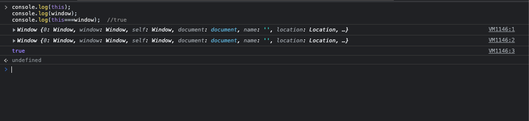 전역공간에서 this는 전역 객체이고 브라우저환경에서 전역객체는 window, node.js 환경에서는 global 이다.