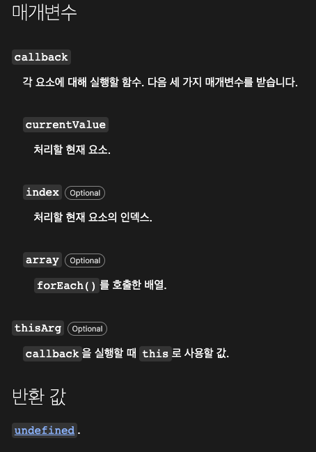 콜백함수를 인자로 받는 메서드 중 일부는 추가로 this로 지정할 객체(thisArg)를 인자로 받는 경우가 있다. 그 예로 위의 forEach메서드를 보면 forEach메서드의 두번째 인자에 this를 넣어주었는데 이건 callback함수를 실행할 때 this로 사용할 값을 결정한다.