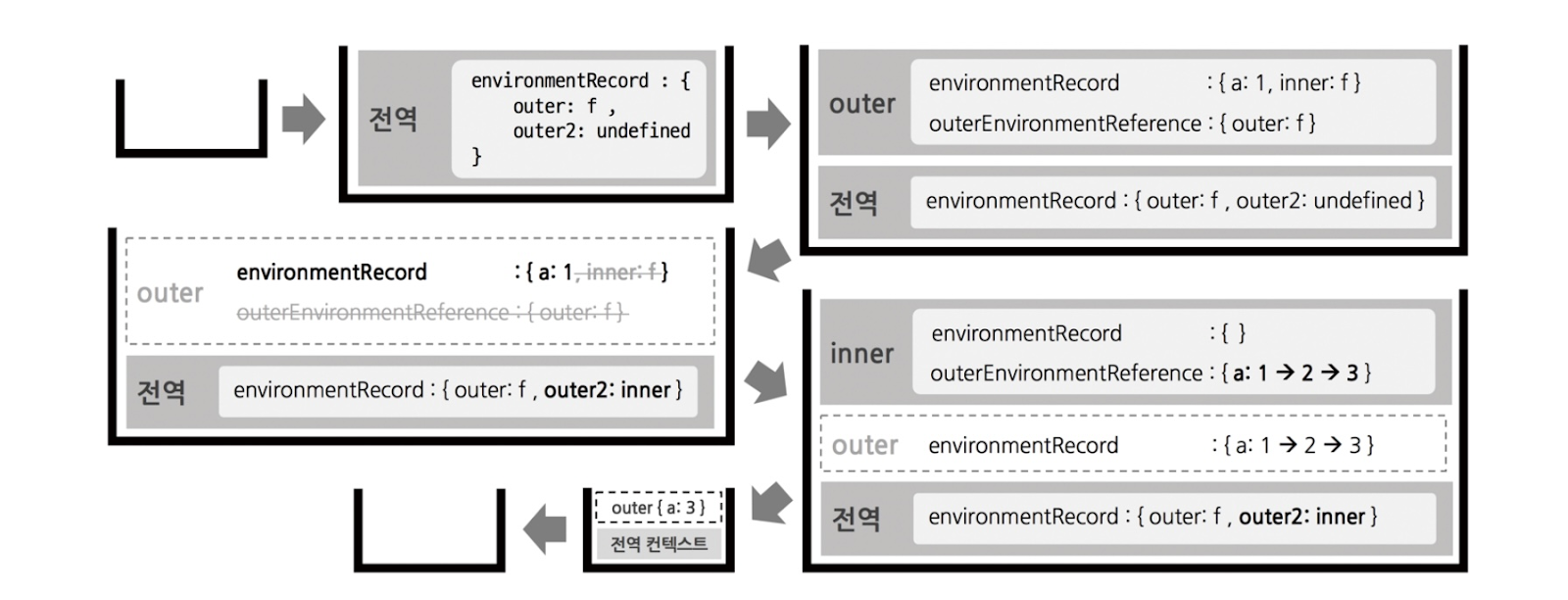 그다음 outer가 실행컨텍스트가 종료되면서 콜스택에서 사라지므로 2를 담은 a라는 정보도 가비지컬렉터에 넘어가면서 소멸된다.