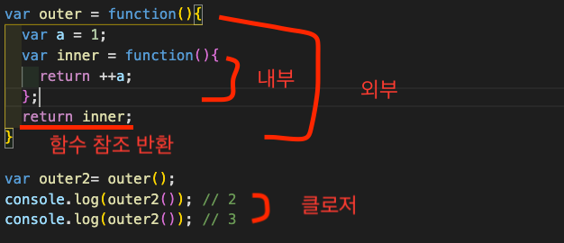 - 해당함수에서 함수자체를 참조함으로써 outer인 외부함수의 실행 컨텍스트가 종료되는 시점에서 가비지 컬렉터의 수집대상에서 제외되어 해당 LexicalEnvironment의 정보를 사용할수 있게 한다.