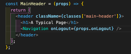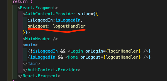또한 함수를 props로 넘겨주는 것 또한 컨텍스트로 사용할 수 있기 때문에 MainHeader에 넘겨주는 onLogout={logoutHandler} 도 지워주고 이를 props로 사용하여 Navigation 컴포넌트에 넘겨주는 onLogout ={props.onLogout}도 지워주었다.