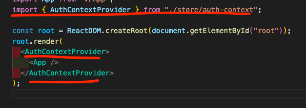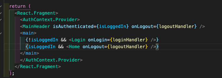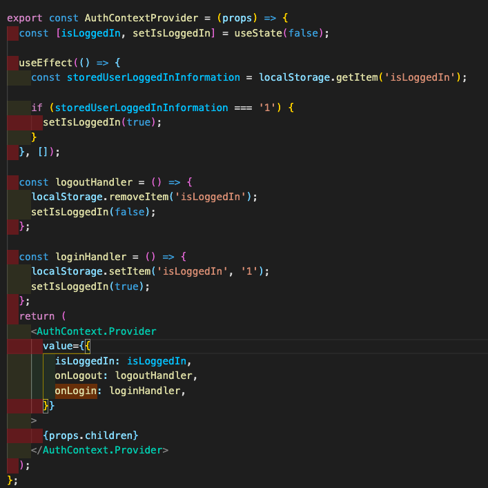따라서 App.js에서 모든 state와 함수를 관리하지말고 auth-context.js에 Provider컴포넌트를 하나 만들어주고 그컴포넌트안에 {props.children}을통해 묶어주기로한다. 그러고나서 App.js에서 사용하고 싶지않은 모든 state와 함수를 옮겨준다.