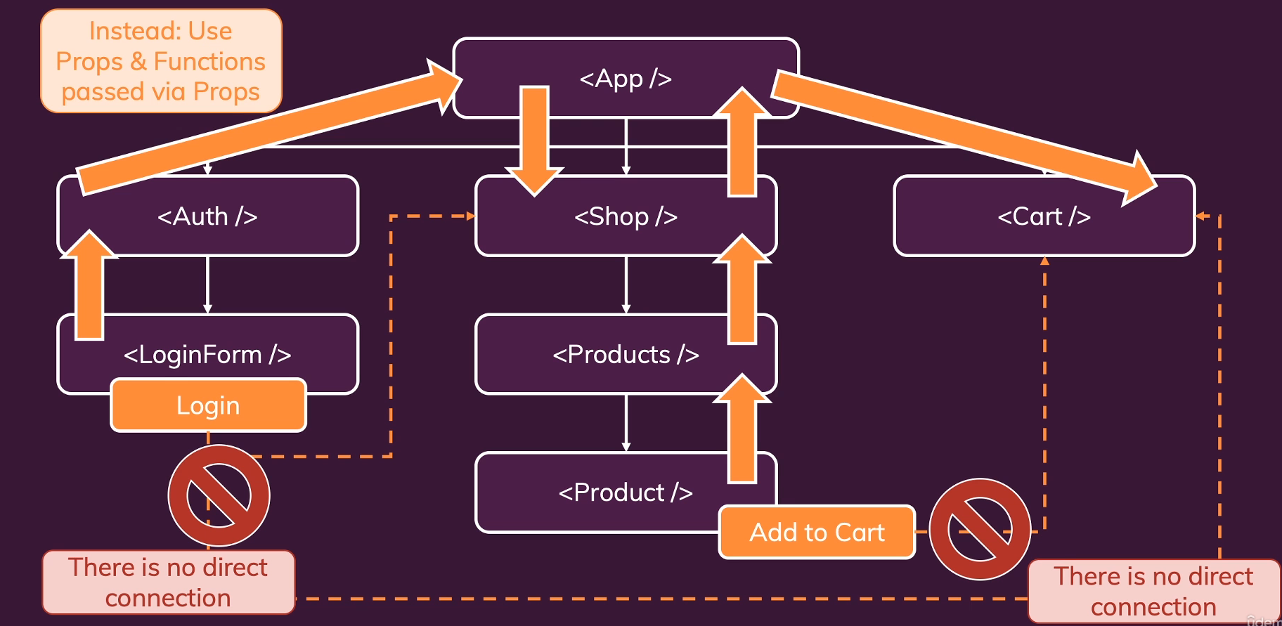 이렇게되면 위의 사진처럼 Login이라는 state를 LoginForm 컴포넌트에서 사용하고 setState로 변화시켜 이 state는 Shop, Cart 컴포넌트에도 영향을 미치는데 전달할수있는 connection이 없다. 또한 Product컴포넌트에서 Add to Cart 라는 장바구니 기능역시 Cart라는 컴포넌트에 영향을 주게 되지만 서로 연결점이없기 때문에 이를 최상위 컴포넌트인 App 컴포넌트에서 state를 생성하여 전달해줘야하는데 이렇게 되면 불필요하게 props drilling이 발생하게되고 유지보수, 코드이해, 수정 등이 어려워지게 된다. 이러한 단점을 보완하기위해 사용하게 되는게 ContextAPI 인데 이렇게 연결점이없는 컴포넌트 간의 state를 direct로 전달하여 이용할 수 있게 해줌으로써 props drilling을 줄임과 동시에 필요한 부분에서만 사용하기때문에 코드이해와 유지보수, 수정이 더 효율적이고 쉬워진다.
