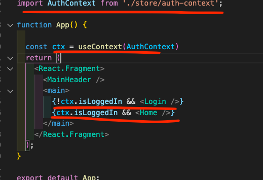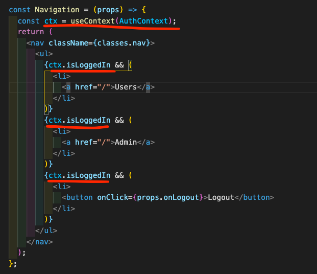 이렇게 하면 ctx안에 있는 isLoggedIn 이라는 객체를 사용할수있고 이는 App.js 에서 value로 넘겨준 state이기 때문에 그에 해당하는 true/false 값이 된다.