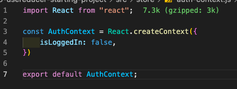 auth-context.js 파일안에 코드는 위와 같은데 contextAPI를 쓰기위한 기본 세팅은 React 내장함수인 createContext를 사용하여 기본 default state를 설정해준다. 이때 해당 값을 담을 변수를 const AuthContext로 만들어 담아주었다.