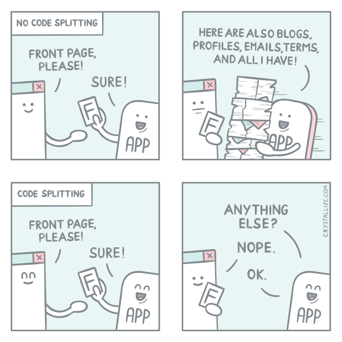 코드 분할 기법은 리액트를 사용했다면 한번쯤 들었을 것이다. 리액트의 특성상 SPA(Sing Page Application)로 하나의 index.html 파일을 불러오고 정적 리소스를 최초 한번에 다운로드하기 때문에 첫 페이지 진입 시 당장 필요하지 않은 코드가 포함된다. 따라서 코드 분할을 통해 당장 필요없는 코드를 떼어 내고 필요한 시점에 로드할 수 있게 한다.