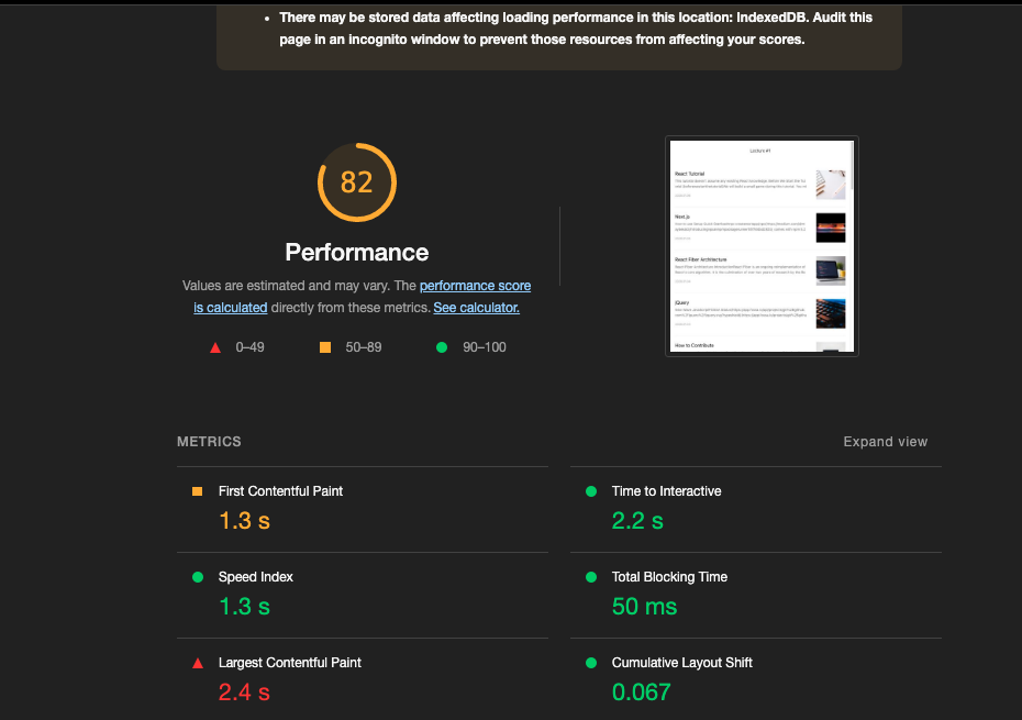 Lighthouse 패널은 구글에서 만들었고 웹사이트의 성능을 측정하고 개선방향을 제시해주는 툴이다. Lighthouse를 통해 성능 점수를 측정하고 해당 페이지의 어느부분을 중점적으로 분석하고 최적화해야하는지 알 수 있다. 예전에는 별도로 설치하여 사용하였지만 지금은 크롬 브라우저에 기본 내장되어 있어 설치없이 손쉽게 이용 가능 하다.