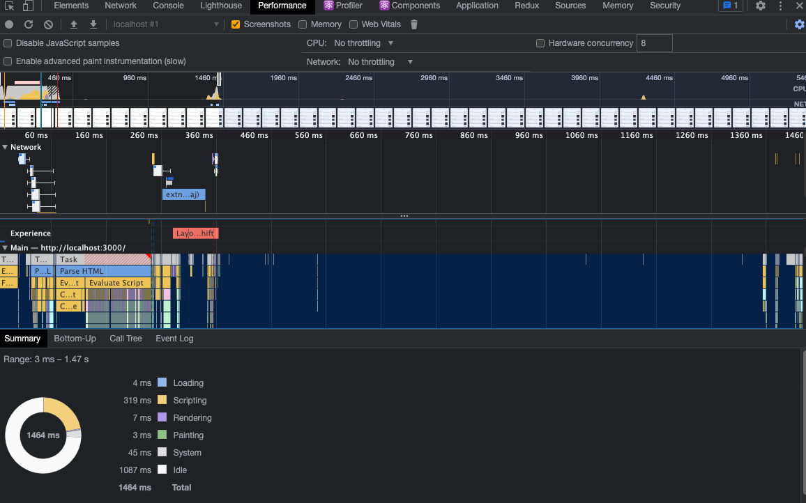 Performance 패널은 웹 페이지가 로드 될때 실행되는 모든 작업들을 타임라인으로 보여준다. Network 패널에서 봤던 리소스가 로드되는 타이밍뿐만 아니라 브라우저의 메인 스레드에서 실행되는 자바스크립트를 차트 형식으로 볼 수 있다. 따라서 이 패널을 통해 어떤 자바스크립트 느린지 확인할 수 있다.