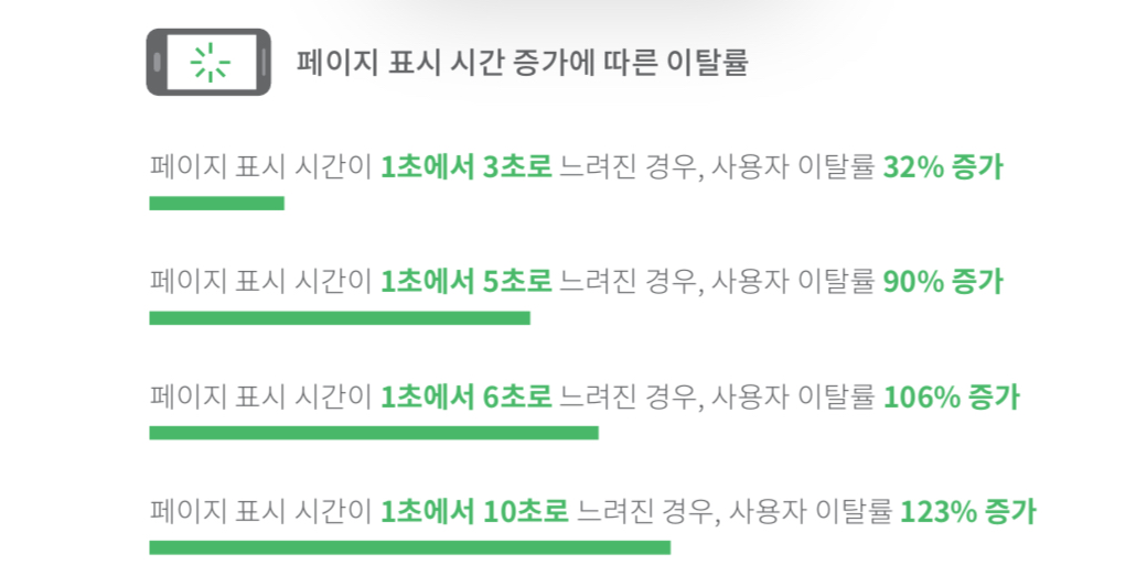 위의 결과만 보더래도 페이지 표시가 3초~10초 지연이 되면 32%~123%만큼 증가되어 이탈률을 갖게 된다는 것이다. 따라서 웹 성능을 최적화 하게되면 서비스 사용자에게 더 나은 사용자 경험(UX)를 제공하기 때문에 가입률과 전환율은 증가되고 이탈률을 감소되어 많은 수익 창출을 할 수 있다.
