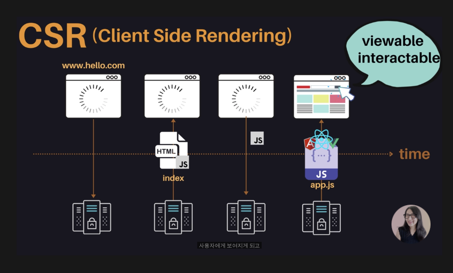 사이트에 접속하고 서버에서 Index.html 파일을 받아온다. 이때 화면상 아무것도없는 텅비어있는 파일이기 때문에 사용자에게 흰화면만 보인다. 이후 index.html에 링크된 모든 로직이 있는 자바스크립트를 받아오고 동적으로 html을 생성할 수 있는 js를 받아온다. 이때부터 웹사이트가 보이게 되고 상호작용이 가능하게 된다-> TTV = TTI