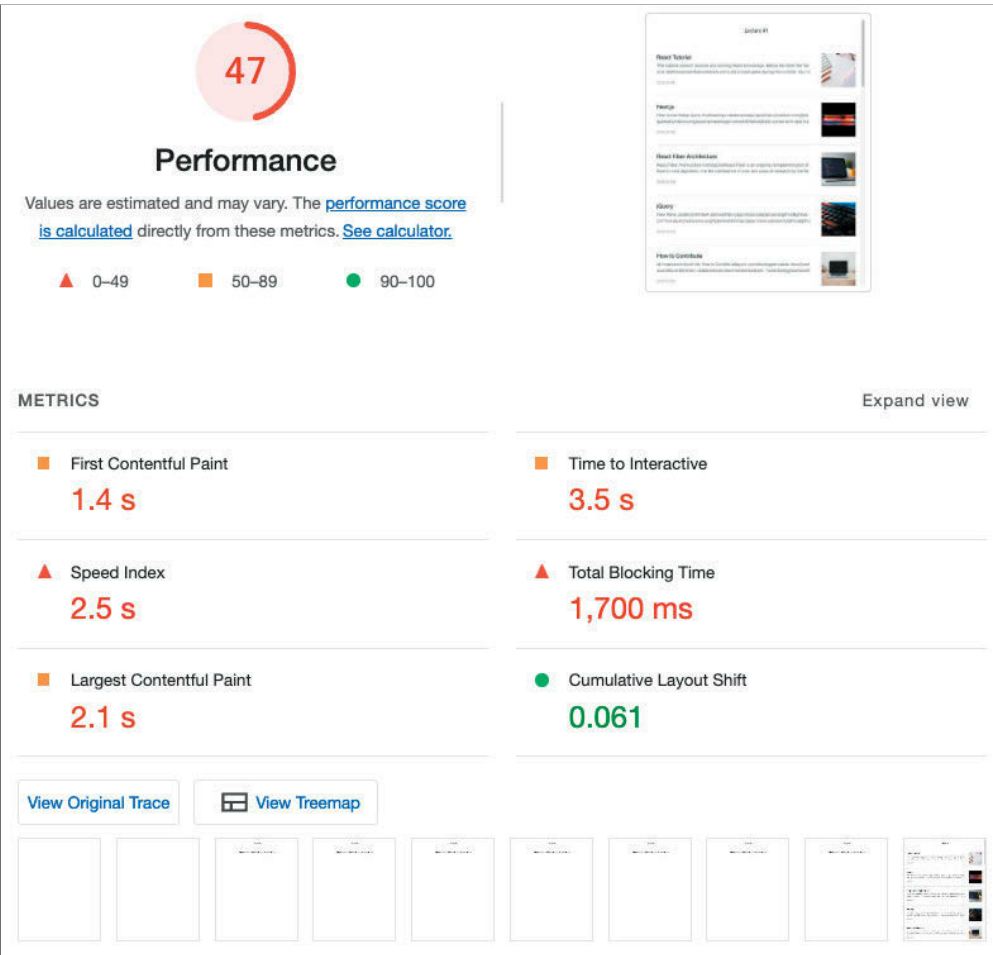 웹 페이지의 종합 성능을 측정하는 툴로써 이전에는 따로 프로그램을 다운로드하여 사용해야했지만 이후에 구글 크롬은 브라우저에 기본내장하여 사용할 수 있도록 했다. Lighthouse를 통해 성능 점수를 매길때 6개의 지표(Metrics)가 있다. 또한 이러한 지표를 웹 바이탈(Web Vitals)이라고 한다.