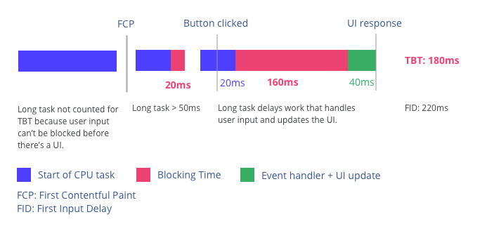 위의 사진을 보면 FCP가 시작된 이후에 long task를 가진 JS를 메인스레드에서 작업할때 long task를 작업하는 동안 interactive 상호작용이 발생하게되면 반응하지 않기 때문에 blocking time이 생긴다. 위의 TTI를 설명할때 long task로 잡는 기준은 50ms초과하는지 안하는지로 측정하게 되는데 blocking time의 경우는 이러한 long task가 메인 스레드에서 작업하는 동안에는 인터렉티브가 발생하지 않기 때문에 50ms를 제외한 나머지 task 걸리는 시간을 의미하는 것이다. 그리고 이러한 blocking time을 갖는 long task들이 여러개 이기때문에 모두 더한게 Total Blocking time, TBT가 되는것이다.