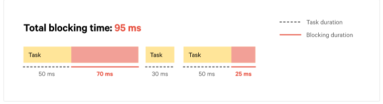 예를들어 한 페이지에서 Long task가 위와같이 2개 있다고 가정해보자. 한 task는 총 120ms가 걸리고 다른하나는 75ms가 걸린다. 이럴때 각각의 task의 50ms를 제외하고 나머지 시간을 더하면 70ms + 25ms이기 때문에 TBT는 95ms라고 한다.