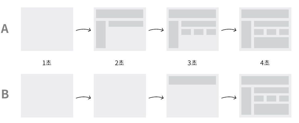Speed Index, SI는 페이지가 로드 중에 콘텐츠가 시각적으로 표시되는 속도를 나타내느 지표이다. 단순히 콘텐츠가 화면에 모두 뜨는 시간이라기 보단 같은 시간이라도 전체페이지에저 일부의 컨텐츠가 언제 뜨는지에 따라 측정 속도가 다르다고 볼수 있다. 아래 그림을 통해 더 자세히 이해해보자.