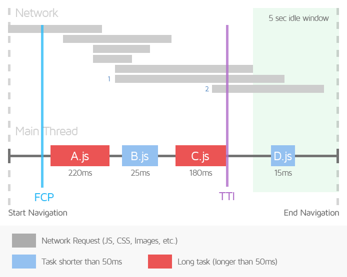 TTI로 측정되는 시간은 FCP가 시작하는곳에서부터 긴 작업, long task(50ms 이상)이 없고(CPU Idle) 전송 중 네트워크 GET 요청이 2개 미만인 기간을 갖는 구간(Network Idle)이 최소 5초정도인 부분(5 sec idle window)을 찾고 그 찾은 부분에서 역방향으로 검색하여 마지막 긴 작업, long task 부분까지의 기간을 측정한다. 만약 긴 작업이 없거나 발견되지 않으면 FCP와 동일한 시간으로 측정된다. 위의 타임라인처럼 A,B,C,D 라는 Js 파일들이 있지만 A와 C만 50ms를 초과하고 B, D는 50ms를 초과하지않기 때문에 end Navigation의 5초의 조용한 구간(idle)에서 역방향으로 검색하여 long task인 C를 찾고 C task가 끝나는 시점까지를 TTI로 측정한 것이다.