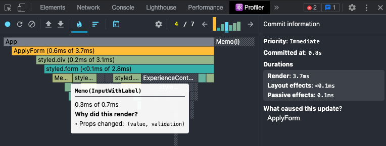 다음은 또다른 input입력되었을때의 시간인데, memo로 감싼부분이 랜더링될때는 다음과같이 색깔이 칠해지면 왜 랜더링 되었는지를 설명해준다 이때 props가 변경되었고 해당 Props 이름은 value, validation 이기 때문이라는 것이다. 그부분을 제외한 오른쪽 부분의 검은 영역이 랜더링 되지않고 넘어간 부분이다 이렇게해서 Render 시간은 3.7ms 가 걸린것이다.