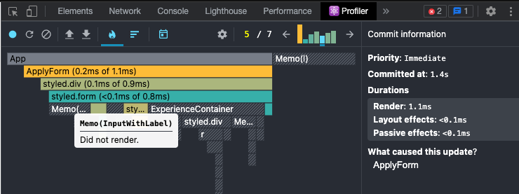 먼저 1 / 7 부분은 처음 리액트를 실행하고 해당 초기 랜딩부분을 보여준다. App이라는 컴포넌트 0.2ms, ApplyForm 컴포넌트 0.2ms, styled.div, ... 이렇게 되어있는데 기본적인 App컴포넌트를 제외하고 ApplyForm 부분이 위의 페이지에 해당하는 페이지에 들어간 로직과 페이지의 전체 컴포넌트였다.