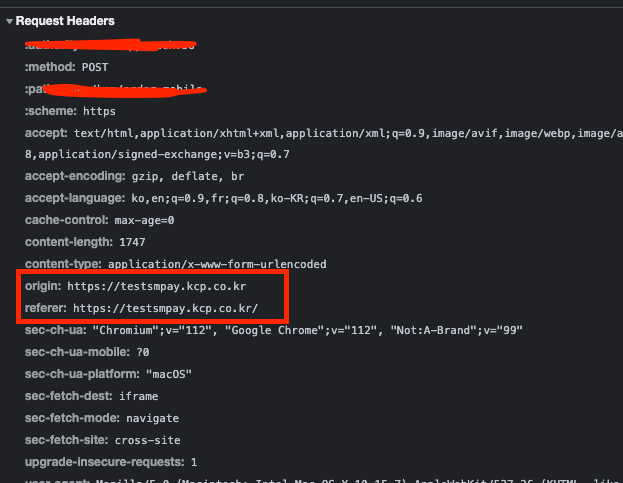 통제권이 KCP쪽에 있기 때문에 network 탭을 보면 request Headers에 Origin, Host, referer 가 KCP쪽으로 되어있다.