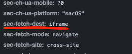 또한 iframe에서 요청을 보내고 받기때문에 요청의 request headers에서 set-fetch-dest를 보면 iframe이라고 되어있다.