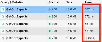 보시다시피 빨간박스의 데이터가 최적화전에 프로들의 목록과 데이터를 불러오는 사항인데 불필요한 데이터까지 불러오기때문에 많은 양과 시간이 걸리는 것을 확인할수 있다.