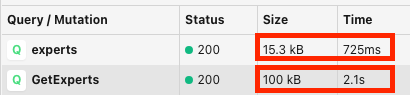 해당 graphql query 와 해당 사이즈, 시간을 측정하기 위해 사용한 툴은 GraphQL Network Inspector 이다.