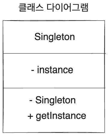 (-)는 private, (+) 는 public을 나타낸다. 따라서 Singleton이라는 클래스이름에 Instance라는 private 맴버 변수가 있고 Singleton 이라는 생성자가 private이고, getIntance는 public 제공된다.