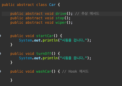 만약 그러고 싶지 않다면 Hook 메서드를 만들어서 사용한다.