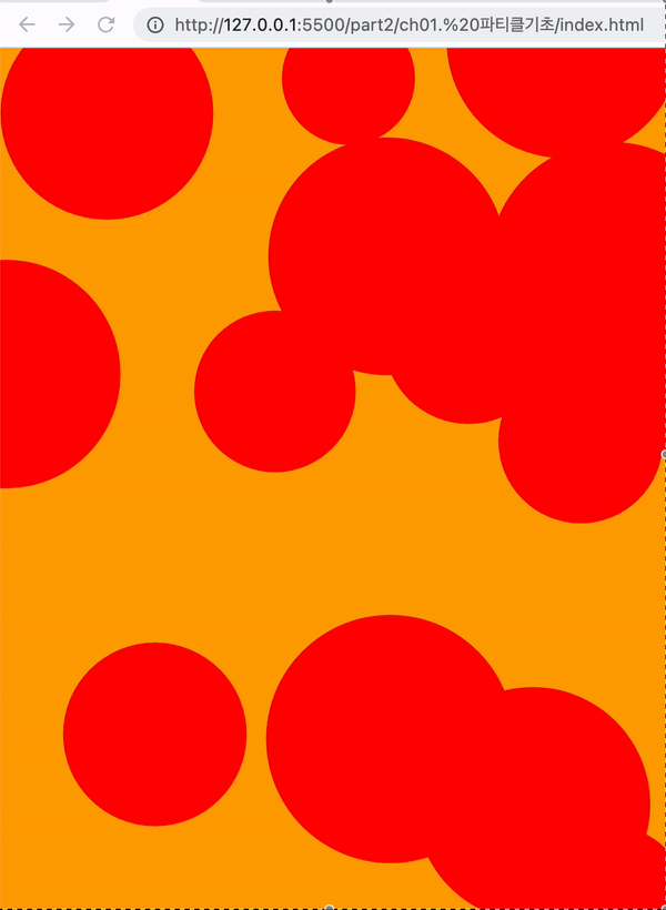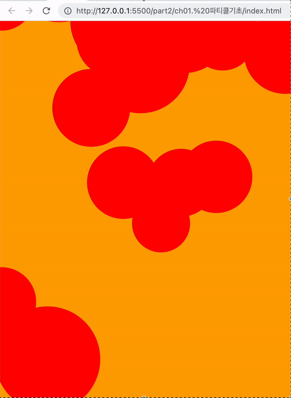 이를 활용하여 여러개의 구를 생성하고 랜덤한 위치와 속도로 애니메이션 효과를 주면 다음과 같다.
